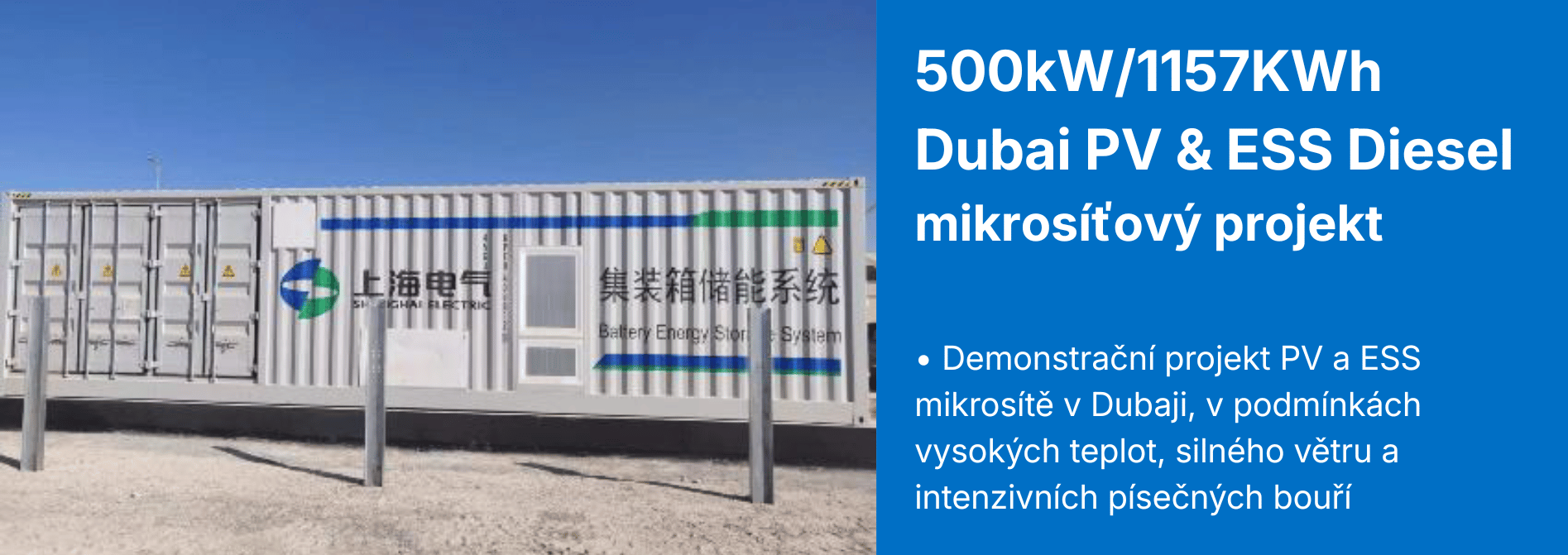 Mnohaleté zkušenosti a know-how Shanghai Electric v oblasti výstavby konvenčních elektráren, systémů obnovitelné energie, přenosu energie, jako EPC dodavatel a výrobce všech nezbytných produktů vytvářejí komplexní konkurenční výhody pro vývoj, výrobu, instalaci a provoz systémů pro ukládání energie (BESS a ESS). Společnost může nabídnout „inovativní“ řešení úložných systémů, rozvaděčů, transformátorových stanic a kompletní EPC služby včetně O&M z jednoho zdroje pro výrobce energie, provozovatele sítí, obchodníky s elektřinou a pro průmysl.