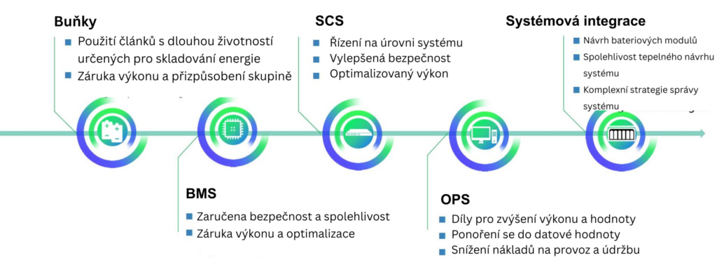 Klíčové komponenty systému BESS (Battery Energy Storage System) zahrnují bateriové moduly nebo články, které ukládají elektrickou energii, měniče, které převádějí stejnosměrný proud (DC) z baterií na střídavý proud (AC) pro použití v síti, systém správy baterií (BMS), který monitoruje a řídí stav baterií, systémy tepelného managementu pro regulaci teploty a zajištění bezpečnosti, systémy pro konverzi energie pro efektivní přenos energie a řídicí systémy, které koordinují provoz, bezpečnostní mechanismy a komunikační rozhraní pro bezproblémovou integraci do sítě.